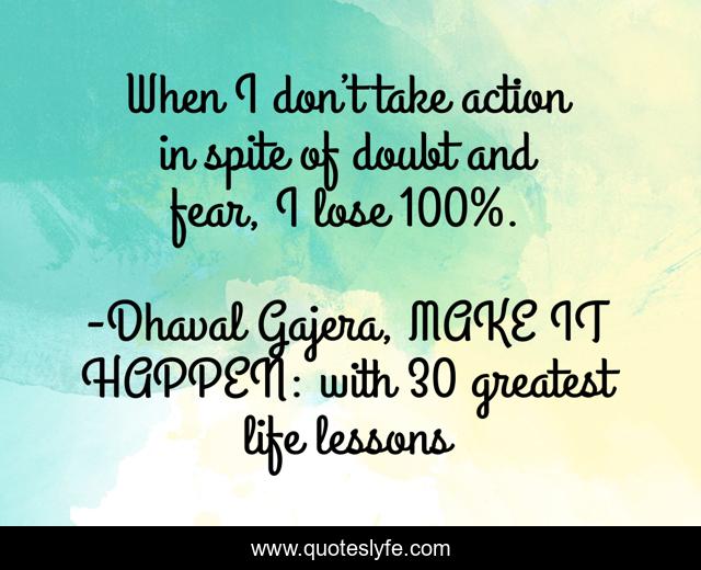 This page presents the quote "When I don’t take action in spite of doubt and fear, I lose 100%.". Author of this quote is Dhaval Gajera, MAKE IT HAPPEN: with 30 greatest life lessons. This quote is about action, fear, doubt, lose,.