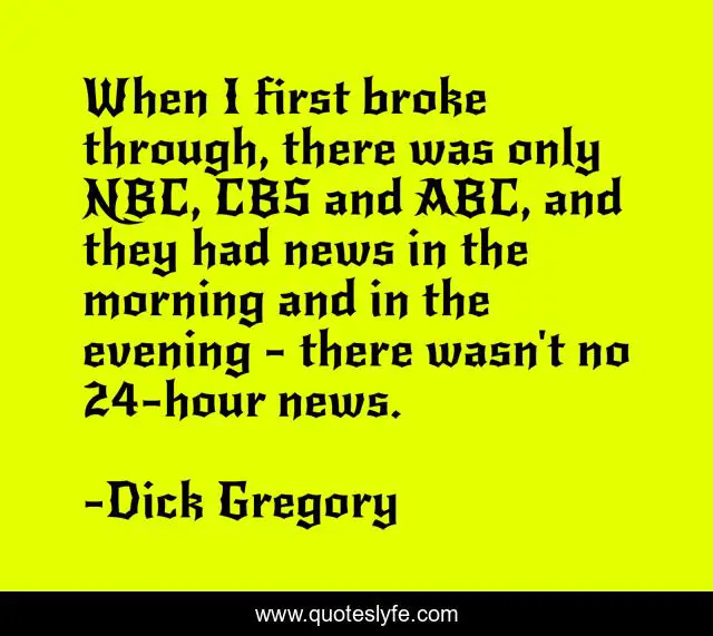 This page presents the quote "When I first broke through, there was only NBC, CBS and ABC, and they had news in the morning and in the evening - there wasn't no 24-hour news.". Author of this quote is Dick Gregory. This quote is about news, evening, through,.