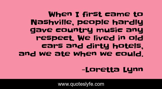 This page presents the quote "When I first came to Nashville, people hardly gave country music any respect. We lived in old cars and dirty hotels, and we ate when we could.". Author of this quote is Loretta Lynn. This quote is about country music, music, people,.