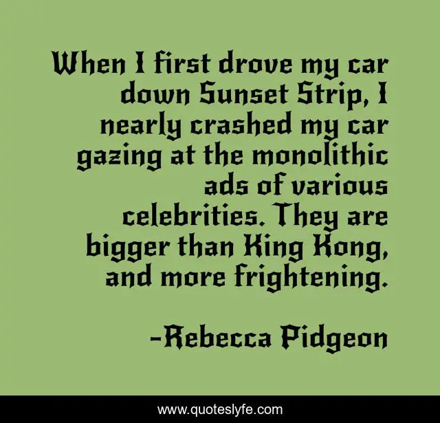 This page presents the quote "When I first drove my car down Sunset Strip, I nearly crashed my car gazing at the monolithic ads of various celebrities. They are bigger than King Kong, and more frightening.". Author of this quote is Rebecca Pidgeon. This quote is about down, king, sunset,.