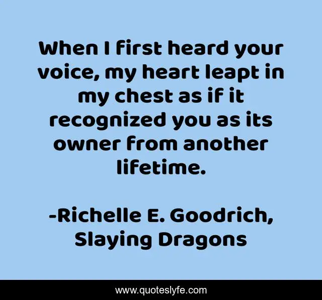 This page presents the quote "When I first heard your voice, my heart leapt in my chest as if it recognized you as its owner from another lifetime.". Author of this quote is Richelle E. Goodrich, Slaying Dragons. This quote is about heart, falling-in-love, love, richelle-e-goodrich, richelle, richelle-goodrich, affection,.