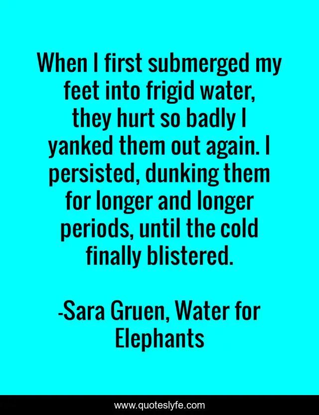 This page presents the quote "When I first submerged my feet into frigid water, they hurt so badly I yanked them out again. I persisted, dunking them for longer and longer periods, until the cold finally blistered.". Author of this quote is Sara Gruen, Water for Elephants. .