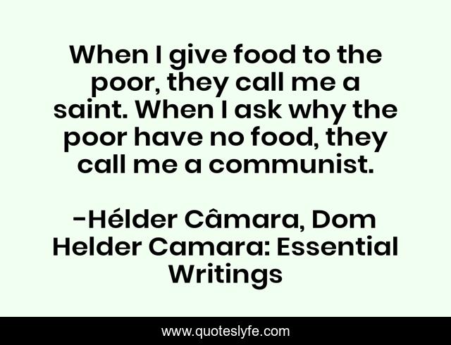 This page presents the quote "When I give food to the poor, they call me a saint. When I ask why the poor have no food, they call me a communist.". Author of this quote is Hélder Câmara, Dom Helder Camara: Essential Writings. This quote is about communism, hunger, compassion, christianity, food, socialism, poverty, charity,.
