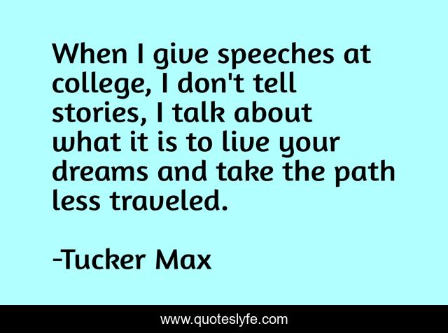 This page presents the quote "When I give speeches at college, I don't tell stories, I talk about what it is to live your dreams and take the path less traveled.". Author of this quote is Tucker Max. This quote is about your dreams, path, college,.