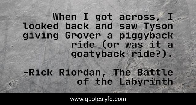 This page presents the quote "When I got across, I looked back and saw Tyson giving Grover a piggyback ride (or was it a goatyback ride?).". Author of this quote is Rick Riordan, The Battle of the Labyrinth. This quote is about percy-jackson, tyson, question, grover-underwood,.