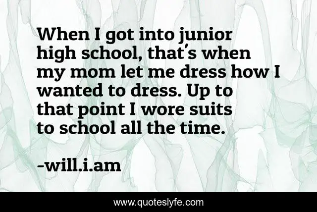 This page presents the quote "When I got into junior high school, that's when my mom let me dress how I wanted to dress. Up to that point I wore suits to school all the time.". Author of this quote is will.i.am. This quote is about school, dress, time,.