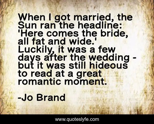 This page presents the quote "When I got married, the Sun ran the headline: 'Here comes the bride, all fat and wide.' Luckily, it was a few days after the wedding - but it was still hideous to read at a great romantic moment.". Author of this quote is Jo Brand. This quote is about sun, great, wedding,.