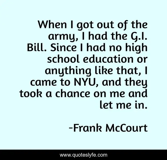 This page presents the quote "When I got out of the army, I had the G.I. Bill. Since I had no high school education or anything like that, I came to NYU, and they took a chance on me and let me in.". Author of this quote is Frank McCourt. This quote is about me, school, education,.