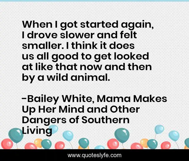 This page presents the quote "When I got started again, I drove slower and felt smaller. I think it does us all good to get looked at like that now and then by a wild animal.". Author of this quote is Bailey White, Mama Makes Up Her Mind and Other Dangers of Southern Living. .