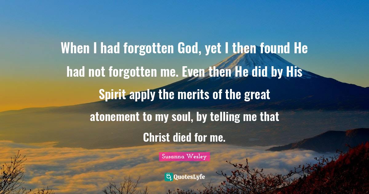 This page presents the quote "When I had forgotten God, yet I then found He had not forgotten me. Even then He did by His Spirit apply the merits of the great atonement to my soul, by telling me that Christ died for me.". Author of this quote is Susanna Wesley. This quote is about soul, atonement, merit, forgotten, found, christ, god, spirit, died,.