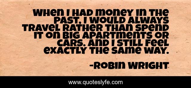 This page presents the quote "When I had money in the past, I would always travel rather than spend it on big apartments or cars. And I still feel exactly the same way.". Author of this quote is Robin Wright. This quote is about past, money, way,.