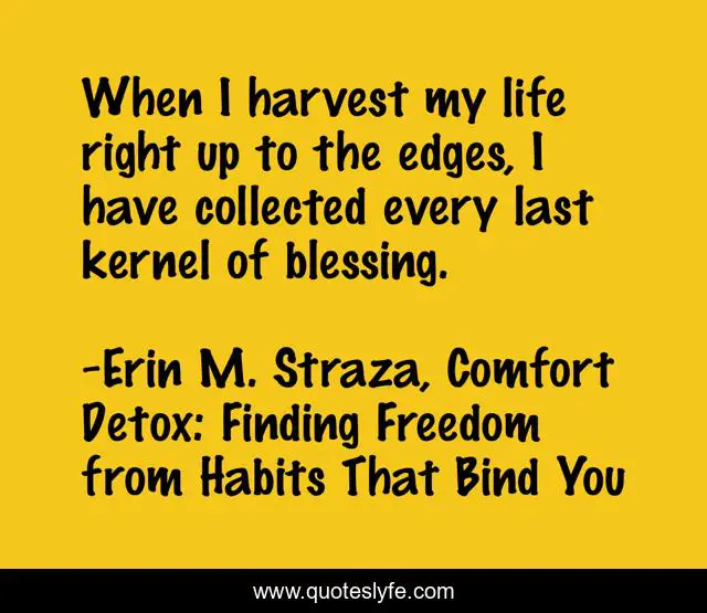 This page presents the quote "When I harvest my life right up to the edges, I have collected every last kernel of blessing.". Author of this quote is Erin M. Straza, Comfort Detox: Finding Freedom from Habits That Bind You. This quote is about faith, comfort, decisions, giving-and-receiving,.