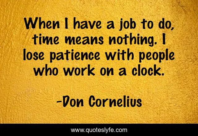 This page presents the quote "When I have a job to do, time means nothing. I lose patience with people who work on a clock.". Author of this quote is Don Cornelius. This quote is about job, work, time,.