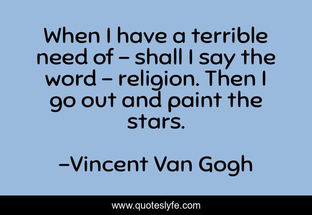 This page presents the quote "When I have a terrible need of - shall I say the word - religion. Then I go out and paint the stars.". Author of this quote is Vincent Van Gogh. This quote is about religion, stars, paint,.
