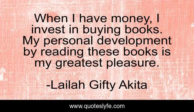 This page presents the quote "When I have money, I invest in buying books. My personal development by reading these books is my greatest pleasure.". Author of this quote is Lailah Gifty Akita. This quote is about reading-motivation, reading-books, books, personal-development, reading-for-life, reading-habits,.