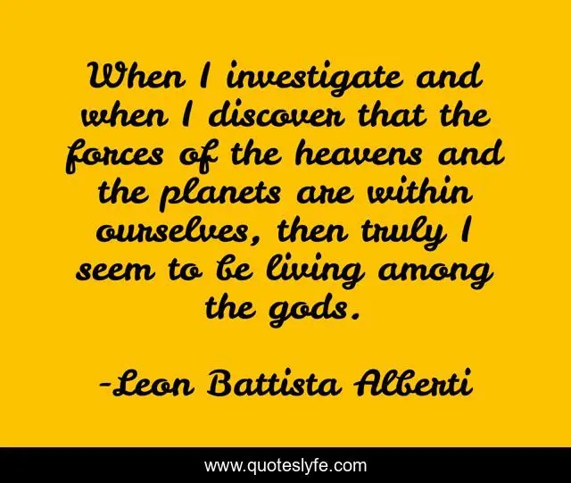 This page presents the quote "When I investigate and when I discover that the forces of the heavens and the planets are within ourselves, then truly I seem to be living among the gods.". Author of this quote is Leon Battista Alberti. This quote is about living, within, discover,.