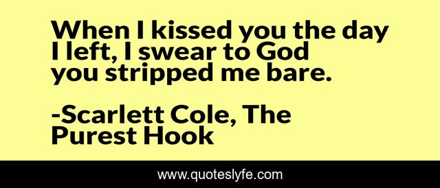 This page presents the quote "When I kissed you the day I left, I swear to God you stripped me bare.". Author of this quote is Scarlett Cole, The Purest Hook. This quote is about romance, contemporary-romance,.