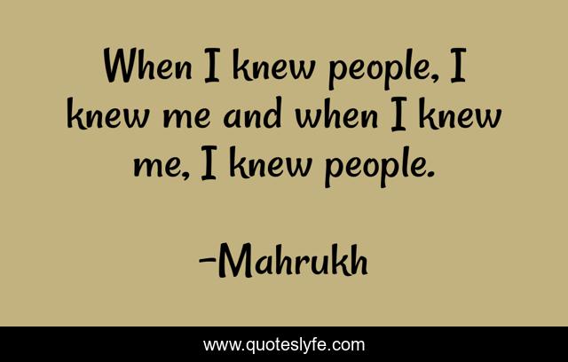 This page presents the quote "When I knew people, I knew me and when I knew me, I knew people.". Author of this quote is Mahrukh. This quote is about me, people,.