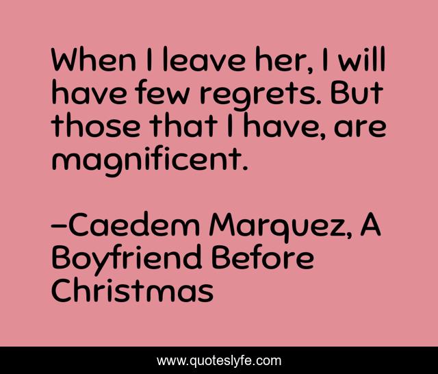 This page presents the quote "When I leave her, I will have few regrets. But those that I have, are magnificent.". Author of this quote is Caedem Marquez, A Boyfriend Before Christmas. .