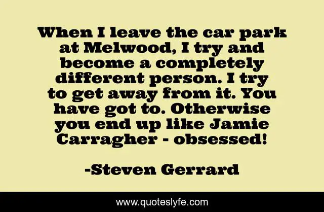 This page presents the quote "When I leave the car park at Melwood, I try and become a completely different person. I try to get away from it. You have got to. Otherwise you end up like Jamie Carragher - obsessed!". Author of this quote is Steven Gerrard. This quote is about try, end,.