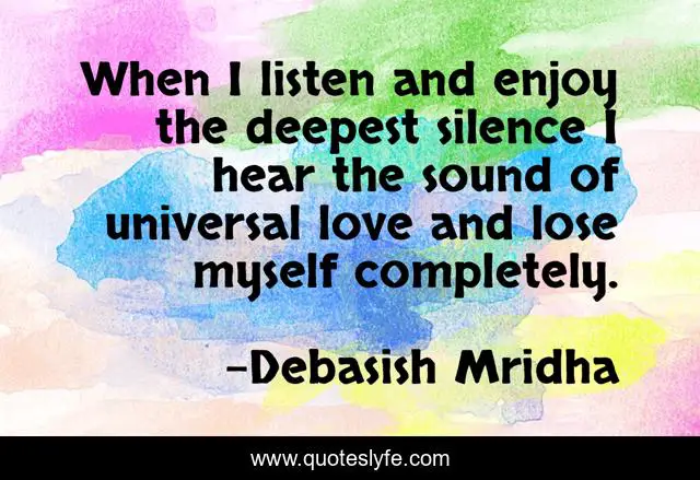 This page presents the quote "When I listen and enjoy the deepest silence I hear the sound of universal love and lose myself completely.". Author of this quote is Debasish Mridha. This quote is about life, love, knowledge, inspirational, intelligence, philosophy, wisdom, quotes, affection,.