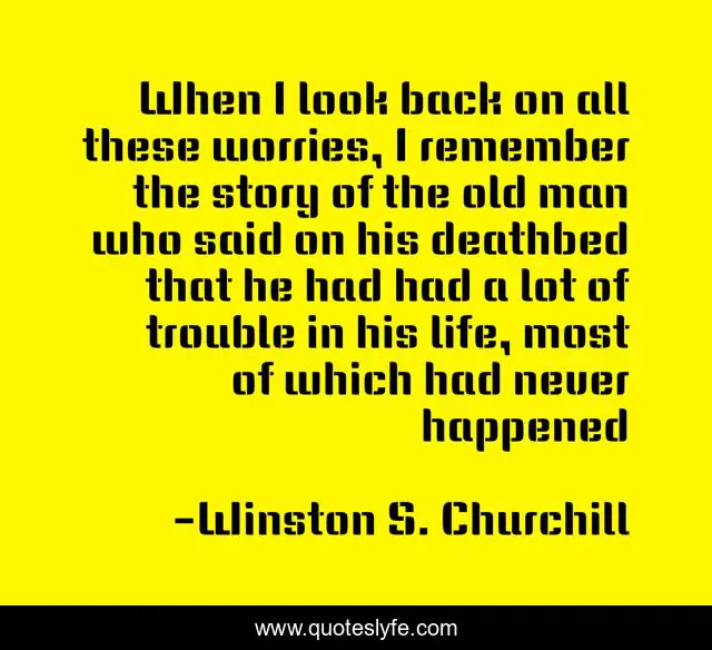 This page presents the quote "When I look back on all these worries, I remember the story of the old man who said on his deathbed that he had had a lot of trouble in his life, most of which had never happened". Author of this quote is Winston S. Churchill. This quote is about enthusiasm, life, inspirational, worry,.