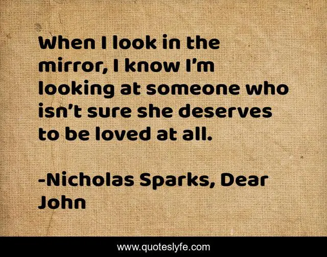 This page presents the quote "When I look in the mirror, I know I’m looking at someone who isn’t sure she deserves to be loved at all.". Author of this quote is Nicholas Sparks, Dear John. This quote is about life, love, affection,.