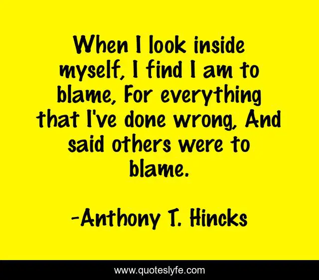 This page presents the quote "When I look inside myself, I find I am to blame, For everything that I've done wrong, And said others were to blame.". Author of this quote is Anthony T. Hincks. This quote is about said, look, inside, blame, everything, wrong, done, others, mysef,.