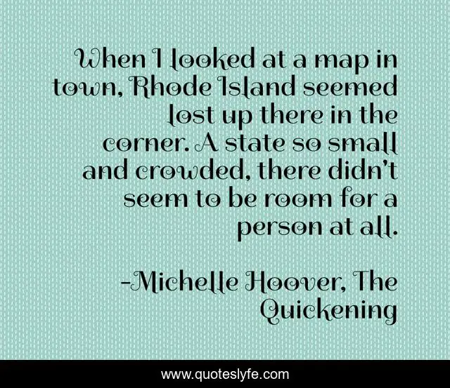 This page presents the quote "When I looked at a map in town, Rhode Island seemed lost up there in the corner. A state so small and crowded, there didn't seem to be room for a person at all.". Author of this quote is Michelle Hoover, The Quickening. This quote is about states, home, rhode-island, ri, maps,.