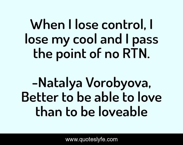 This page presents the quote "When I lose control, I lose my cool and I pass the point of no RTN.". Author of this quote is Natalya Vorobyova, Better to be able to love than to be loveable. This quote is about control, humor, point-of-no-return, loss-of-control, cool,.