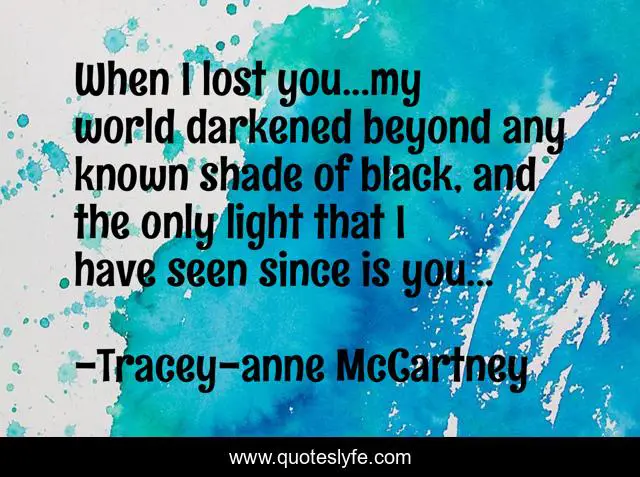 This page presents the quote "When I lost you...my world darkened beyond any known shade of black, and the only light that I have seen since is you...". Author of this quote is Tracey-anne McCartney. This quote is about spiritual, a-carpet-of-purple-flowers, love, light, soul, romance, book, quote, affection,.