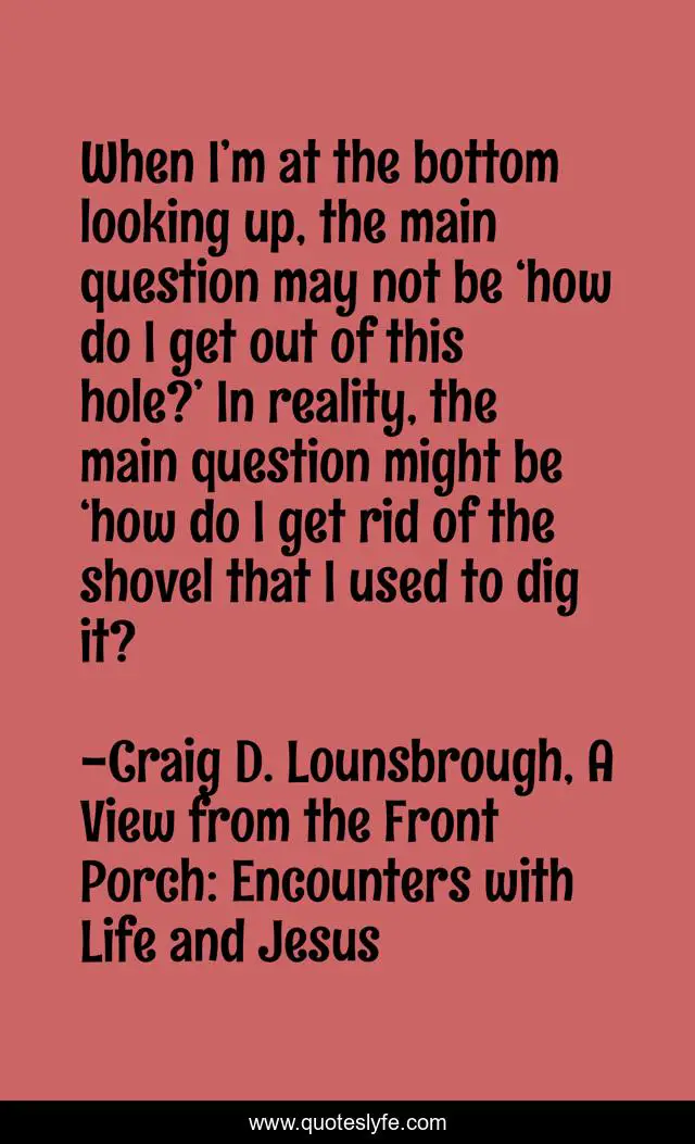 This page presents the quote "When I’m at the bottom looking up, the main question may not be ‘how do I get out of this hole?’ In reality, the main question might be ‘how do I get rid of the shovel that I used to dig it?". Author of this quote is Craig D. Lounsbrough, A View from the Front Porch: Encounters with Life and Jesus. This quote is about shovel, honesty, bottom, self-discovery, dig, question, responsible, accountability, difficulty,.