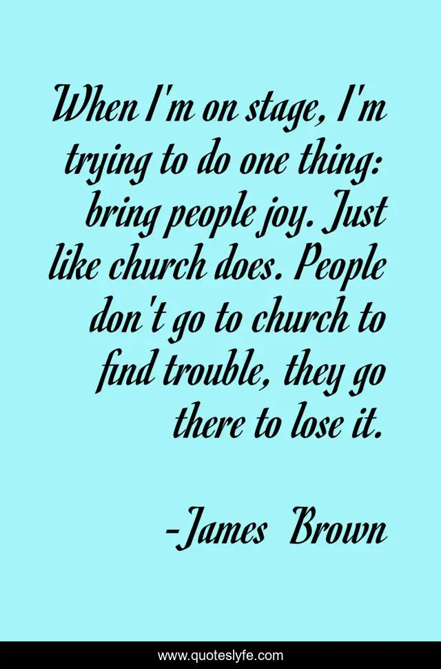 This page presents the quote "When I'm on stage, I'm trying to do one thing: bring people joy. Just like church does. People don't go to church to find trouble, they go there to lose it.". Author of this quote is James Brown. This quote is about joy, music,.