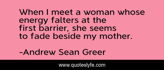 This page presents the quote "When I meet a woman whose energy falters at the first barrier, she seems to fade beside my mother.". Author of this quote is Andrew Sean Greer. This quote is about relationships, enthusiasm, woman, inspirational,.