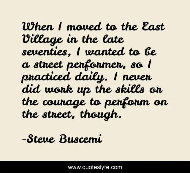 This page presents the quote "When I moved to the East Village in the late seventies, I wanted to be a street performer, so I practiced daily. I never did work up the skills or the courage to perform on the street, though.". Author of this quote is Steve Buscemi. This quote is about late, work, daily,.