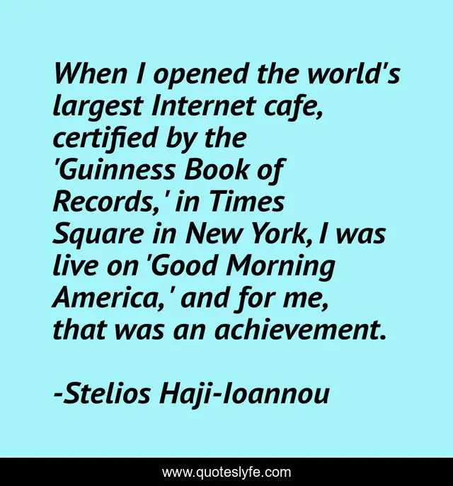 This page presents the quote "When I opened the world's largest Internet cafe, certified by the 'Guinness Book of Records, ' in Times Square in New York, I was live on 'Good Morning America, ' and for me, that was an achievement.". Author of this quote is Stelios Haji-Ioannou. This quote is about good, america, achievement,.