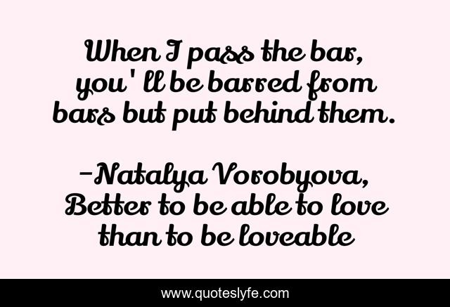 This page presents the quote "When I pass the bar, you'll be barred from bars but put behind them.". Author of this quote is Natalya Vorobyova, Better to be able to love than to be loveable. This quote is about bars, bar, wordplay, lawyer, prison, humor, law,.