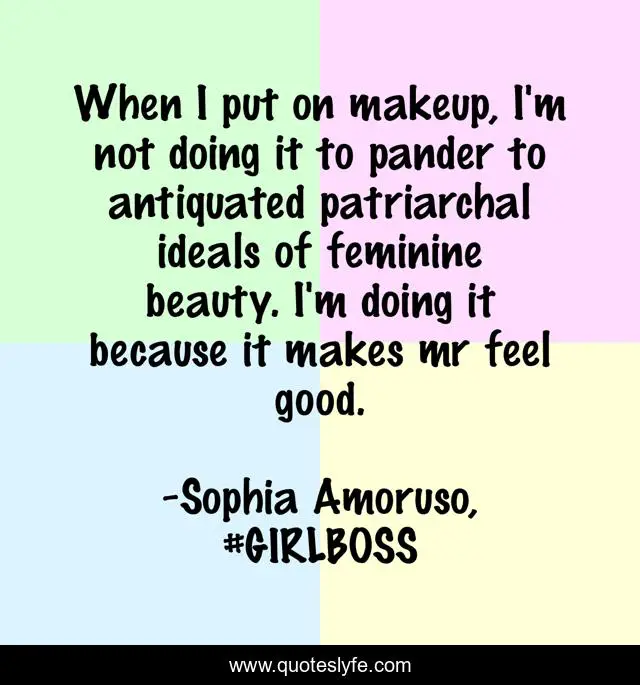 This page presents the quote "When I put on makeup, I'm not doing it to pander to antiquated patriarchal ideals of feminine beauty. I'm doing it because it makes mr feel good.". Author of this quote is Sophia Amoruso, #GIRLBOSS. This quote is about beauty, confident, girlboss, makeup, feminine, feminine-beauty,.