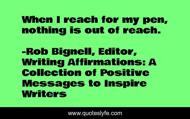 This page presents the quote "When I reach for my pen, nothing is out of reach.". Author of this quote is Rob Bignell, Editor, Writing Affirmations: A Collection of Positive Messages to Inspire Writers. This quote is about writers-inspiration, writers-life, writing-life, writing, writers, writers-on-writing, writing-advice,.