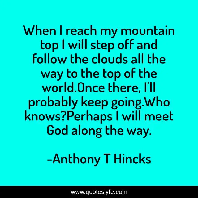 This page presents the quote "When I reach my mountain top I will step off and follow the clouds all the way to the top of the world.Once there, I'll probably keep going.Who knows?Perhaps I will meet God along the way.". Author of this quote is Anthony T Hincks. This quote is about life, clouds, being, god, philosophy, meet, world, mountain-top,.