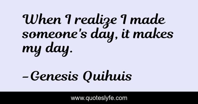 This page presents the quote "When I realize I made someone's day, it makes my day.". Author of this quote is Genesis Quihuis. This quote is about make-your-day, kindness, day, realize,.
