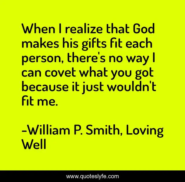 This page presents the quote "When I realize that God makes his gifts fit each person, there's no way I can covet what you got because it just wouldn't fit me.". Author of this quote is William P. Smith, Loving Well. This quote is about gifts, coveting, envy, christianity, theology,.