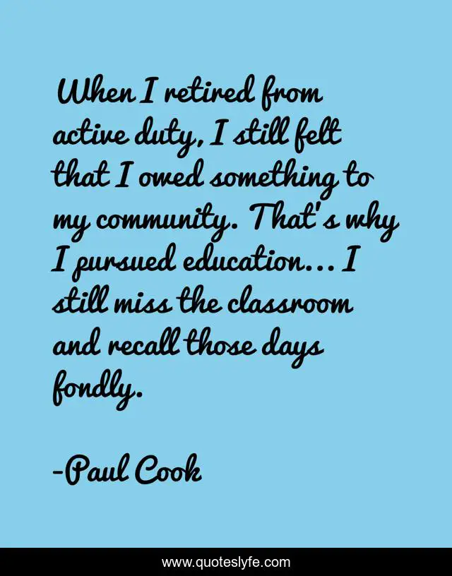 This page presents the quote "When I retired from active duty, I still felt that I owed something to my community. That's why I pursued education... I still miss the classroom and recall those days fondly.". Author of this quote is Paul Cook. This quote is about classroom, why, community,.