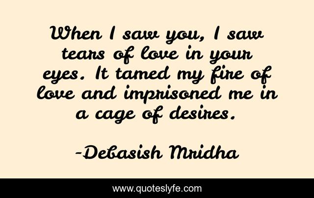This page presents the quote "When I saw you, I saw tears of love in your eyes. It tamed my fire of love and imprisoned me in a cage of desires.". Author of this quote is Debasish Mridha. This quote is about philosophy, fire-of-love, debasish-mridha, quotes, debasish-mridha-md, inspirational, cage-of-desires, tears-of-love, love-in-your-eyes,.
