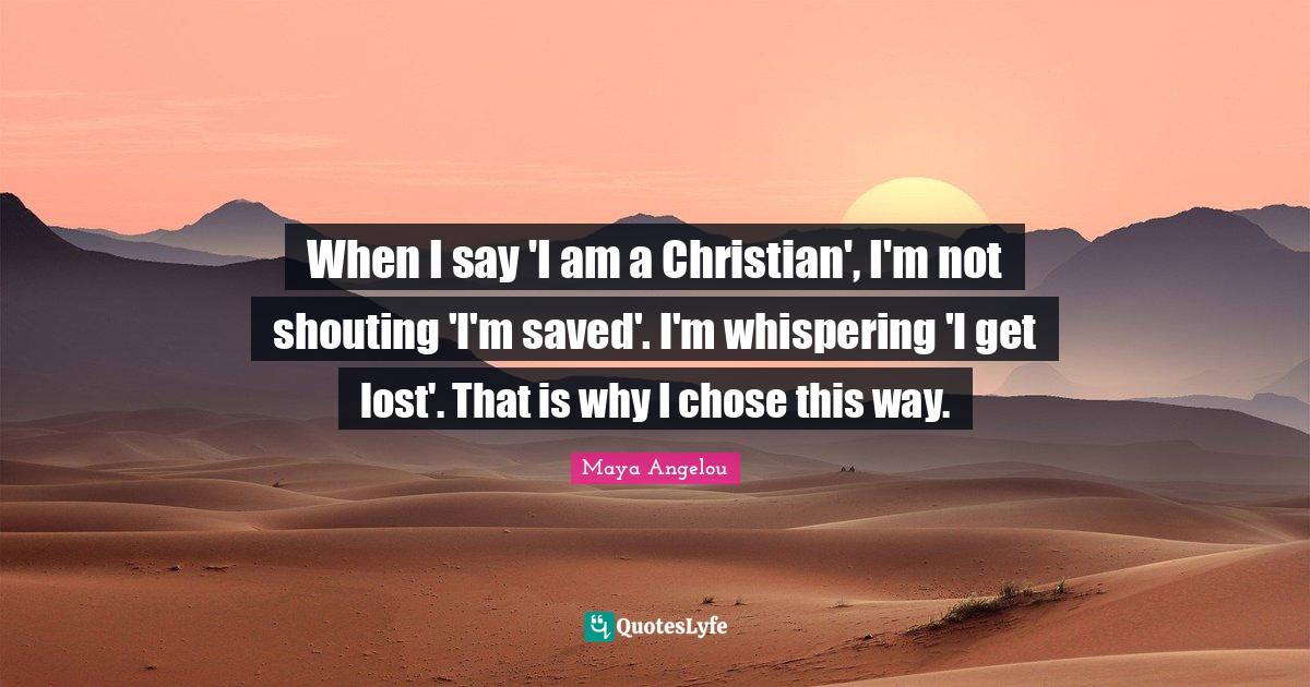 This page presents the quote "When I say 'I am a Christian', I'm not shouting 'I'm saved'. I'm whispering 'I get lost'. That is why I chose this way.". Author of this quote is Maya Angelou. This quote is about way, lost, christian, whispering, saved, shouting,.