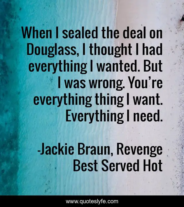 This page presents the quote "When I sealed the deal on Douglass, I thought I had everything I wanted. But I was wrong. You’re everything thing I want. Everything I need.". Author of this quote is Jackie Braun, Revenge Best Served Hot. This quote is about happy-endings, love-conquers-all, contemporary-romance, revenge,.