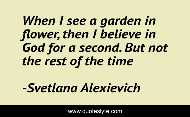 This page presents the quote "When I see a garden in flower, then I believe in God for a second. But not the rest of the time". Author of this quote is Svetlana Alexievich. This quote is about atheism-and-attitude, natures-beauty, belief, nature, god, secularism, atheism, spirituality, new-yorker-magazine,.