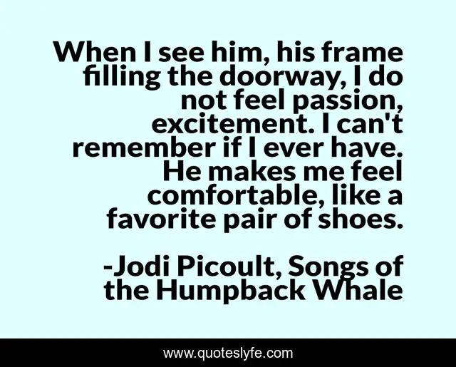This page presents the quote "When I see him, his frame filling the doorway, I do not feel passion, excitement. I can't remember if I ever have. He makes me feel comfortable, like a favorite pair of shoes.". Author of this quote is Jodi Picoult, Songs of the Humpback Whale. This quote is about love, comfortable, attraction, marriage, spark-in-a-relationship, affection,.