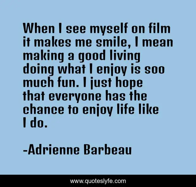 This page presents the quote "When I see myself on film it makes me smile, I mean making a good living doing what I enjoy is soo much fun. I just hope that everyone has the chance to enjoy life like I do.". Author of this quote is Adrienne Barbeau. This quote is about life, good, hope,.