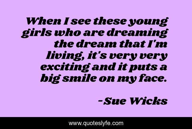 This page presents the quote "When I see these young girls who are dreaming the dream that I'm living, it's very very exciting and it puts a big smile on my face.". Author of this quote is Sue Wicks. This quote is about living, see, dream,.